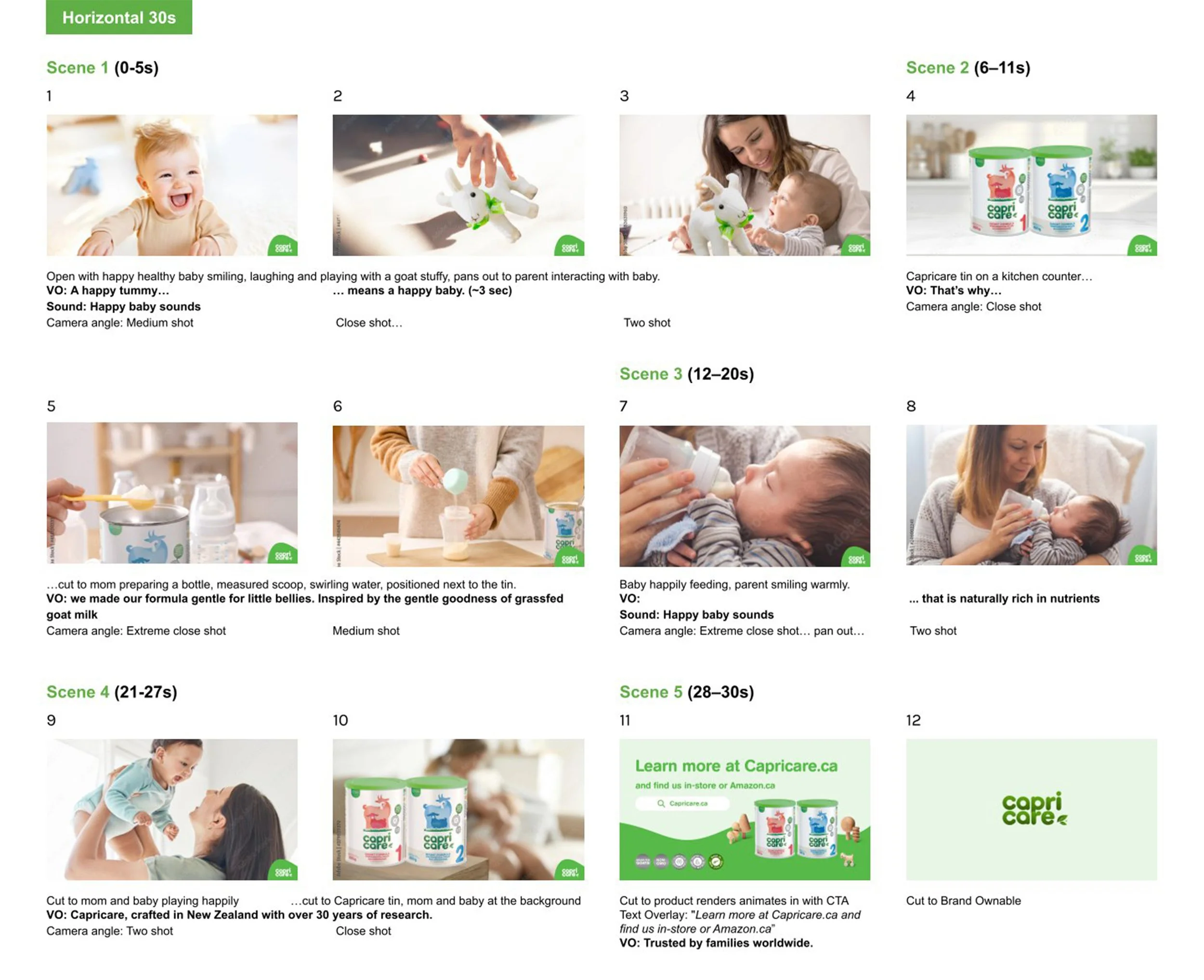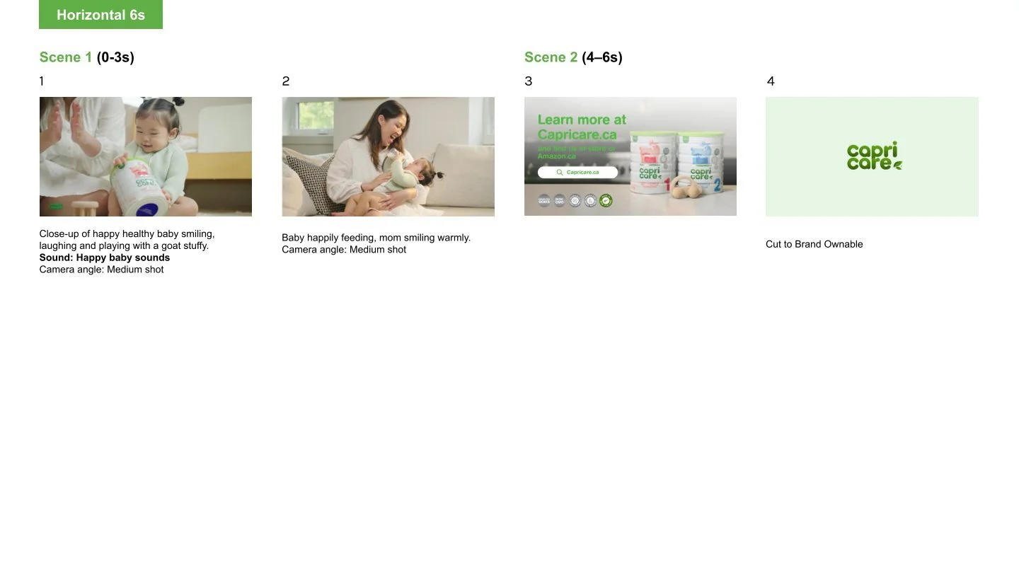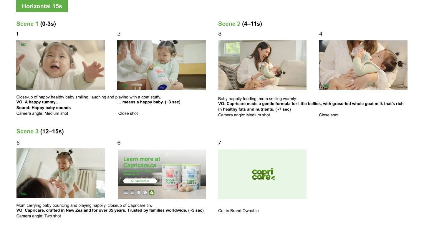 In this collaborative project for Capricare, I worked alongside a videographer/editor and design lead to produce a high-production brand video. I was responsible for the initial storyboarding, using curated stock imagery to visualize the 30-second narrative flow and identify the key shots needed for the shoot. Following production, I created additional storyboards for 15- and 6-second cutdowns using screenshots from the raw footage to ensure the core message remained impactful in shorter formats.